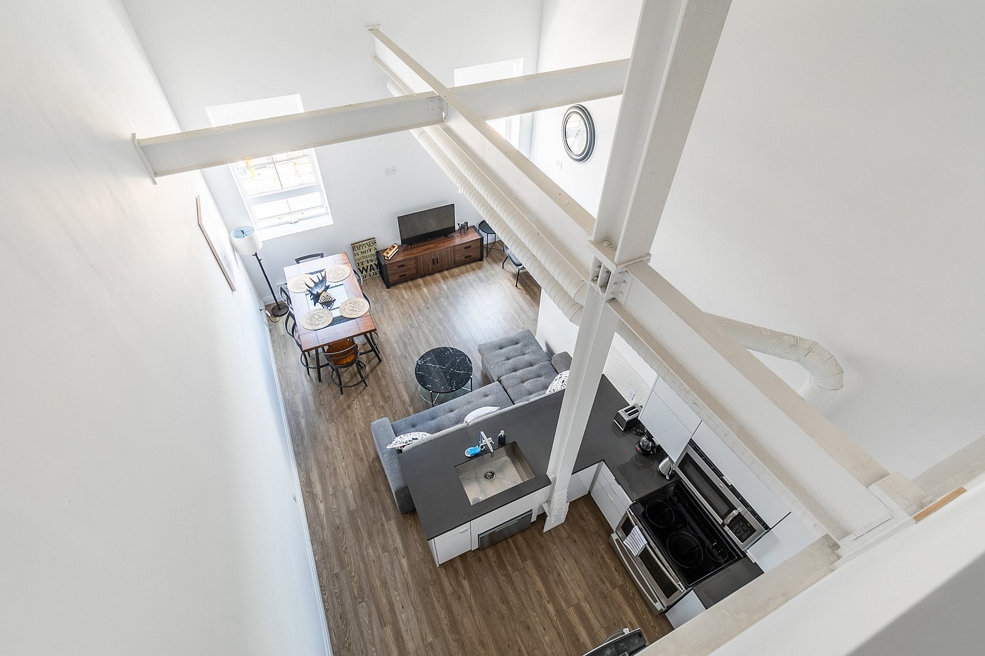 Completed in 2019, this modern loft-style building blends industrial charm with contemporary living, offering spacious 1-bedroom and 2-bedroom units that boast high 14+ ft ceilings, sleek laminate flooring, and gourmet kitchens with stainless steel appliances and quartz countertops.